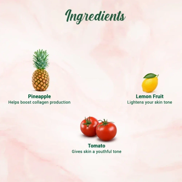 Pineapple is known to boost collagen production, contributing to firmer and more youthful-looking skin. Tomato extracts give the skin a youthful appearance, while lemon in this brightening fruit cream helps lighten the skin tone, giving it a brighter and more even complexion.