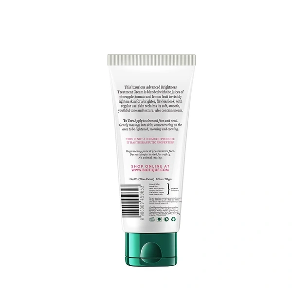 This luxurious Advanced Brightening soft cream moisturizer is blended with the juices of pineapple, tomato, and lemon fruit to visibly lighten skin for a brighter, flawless look, with regular use, skin reclaims its soft, smooth, youthful tone and texture. Also contains neem.