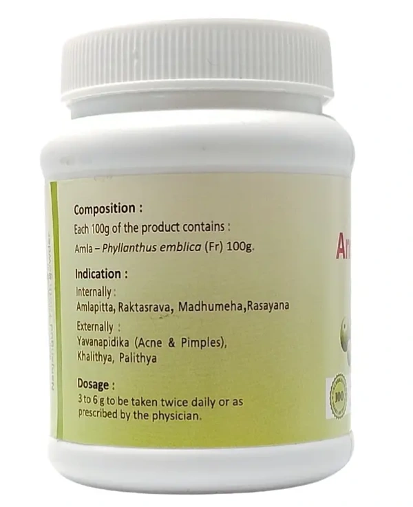 AMLA CHURNA by B V PUNDIT'S is an ayurvedic single herb product. Indian gooseberry or AMLA, as it is more popularly known is a very potent herb and is used in many ayurvedic medicines uses, Amla is useful for oral care.respiratory problems and boost- immunity. INDICATION: Respiratory problems, boost- immunity. DOSAGE: As directed by the physician.