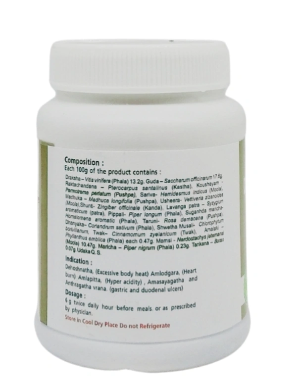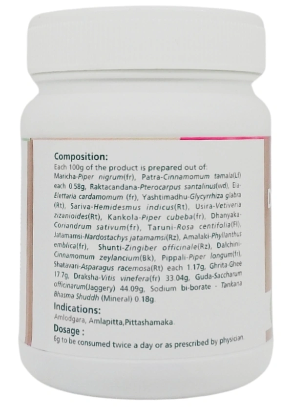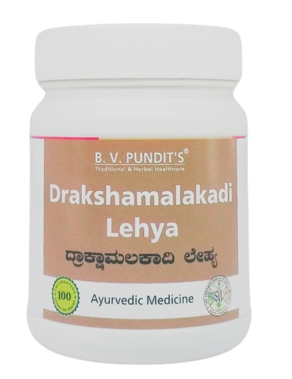 DRAKSHAMALAKADI LEHYA by B V PUNDIT'S is an ayurvedic classical preparation. It is known to be very effective in treating pitta vitiation conditions as well for digestive health. INDICATIONS: Denoshnatha, Amlodgara, Amlapitta, Amasayagatha, anthargatha vrana. DOSAGE: 6 g twice daily hour before meals or as prescribed by the physician.