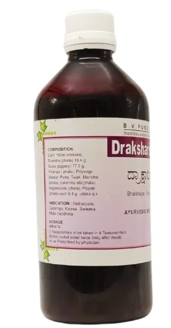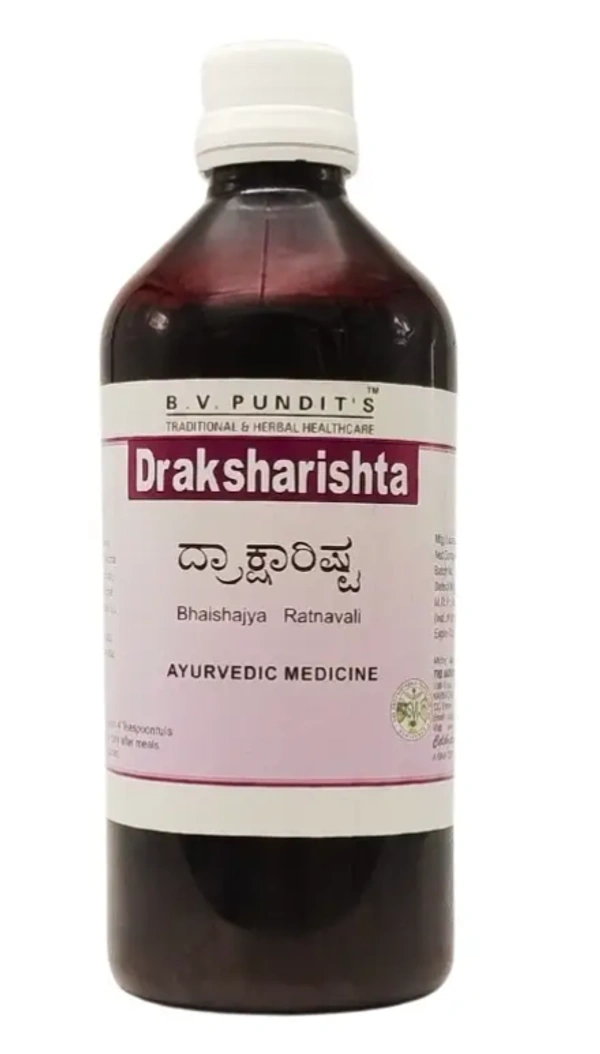Draksharishta by B.V. Pandit is a classical Ayurvedic herbal tonic renowned for its rejuvenating and strengthening properties. Made from high-quality dried grapes (draksha) and other synergistic herbs, this naturally fermented formulation supports digestion, enhances respiratory health, and boosts overall energy levels. Draksharishta is particularly beneficial for improving appetite, reducing fatigue, and addressing general debility.