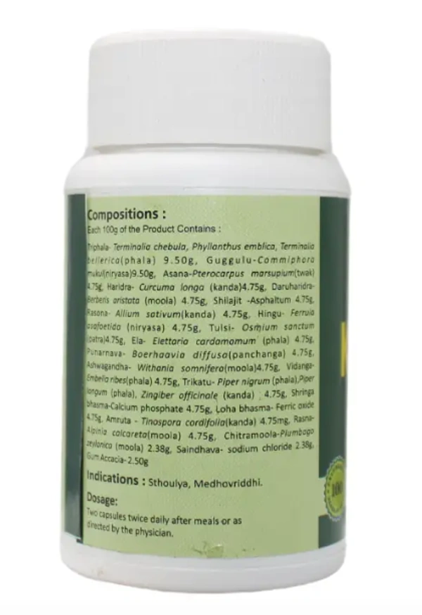 Take 1-2 capsules twice daily, preferably after meals, or as directed by an Ayurvedic physician.