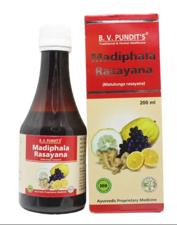 B.V. Pundit's Madiphala Rasayana is an Ayurvedic formulation designed to support digestive health. It is an effective remedy for issues like indigestion, nausea, vomiting, and morning sickness. This herbal preparation is known for its antibilious, anti-emetic, and digestive properties. It helps improve appetite, alleviate bloating, and manage conditions such as dyspepsia, flatulence, and nausea. It is especially helpful for those suffering from digestive disorders, making it an excellent choice for promoting overall stomach health.