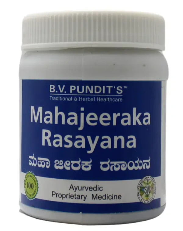 "MAHA JEERAKA RASAYANA by B.V.PANDIT'S is an ayurvedic medicine in form of jam with Jeera as key ingredient. Jeeraka is trichurated with citrus and blended with other herbs which is excellent in tackling vitiated pitta and its ill effects. Indication: Anorexia, dyspepsia, flatulence, belching, rumbling noise in the bowels, stomach pain Dosage: 6 g to be taken twice daily 1/2 an hour before meals or As directed by the physician."