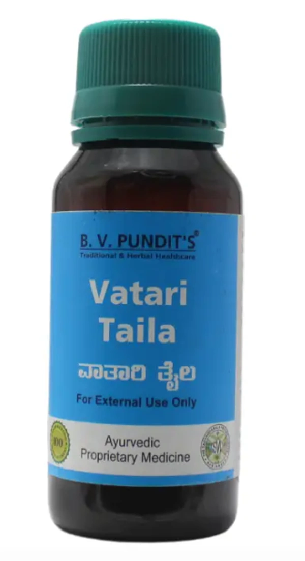 Vatari Taila by B.V. Pandit is a specialized Ayurvedic oil designed to provide relief from joint pain, inflammation, and conditions related to Vata dosha imbalances. With its potent blend of natural ingredients, it helps alleviate discomfort associated with conditions like arthritis, sciatica, and muscle stiffness. This oil works by reducing swelling, improving circulation, and promoting mobility, making it ideal for individuals dealing with chronic pain or joint issues.