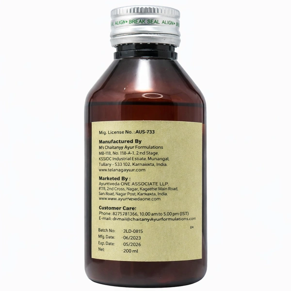 Yashtimadhu Taila is a traditional Ayurvedic oil known for its therapeutic properties, particularly in promoting hair health and addressing skin conditions. Chaitanya Ayur Formulations offers this oil in a 200 ml bottle, formulated with natural ingredients to nourish and strengthen hair follicles, promote healthy hair growth, and prevent premature graying.