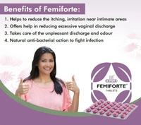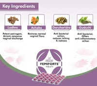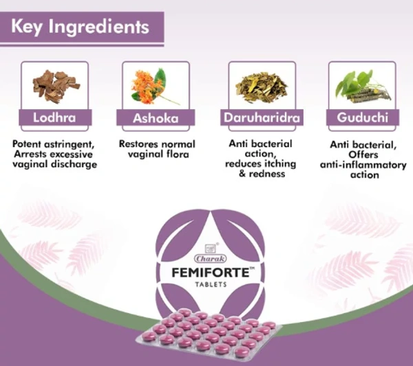 Normally, vaginal discharge is clear or white. A change in the colour or amount of discharge, along with other symptoms like burning, itching and malodour, may indicate of an infection. Malnutrition, poor hygiene further impairs host response, increasing susceptibility to vaginal infection and inflammation leading excessive vaginal discharge. FEMIFORTE contains potent astringents like Ashoka (Saraca indica) and Lodhra (Symplocos racemosa) which arrest excessive vaginal discharge. Tanduliya mool (Amaranthus spinosus), Daruharidra (Berberis aristata), Guduchi (Tinospora cordifolia) exerts anti-microbial and anti-inflammatory actions and hence, FEMIFORTE helps in the management of leucorrhoea(white discharge) and vaginitis and minimizes its recurrence.