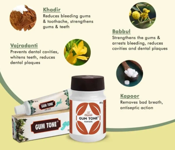 GUM TONE is an Ayurvedic tooth powder which tightens gums and arrests gum bleeding. GUM TONE has herbs like babul and khadir which fight germs and prevent the formation of cavities and dental plaques. Herbs like babul help reduce yellow stain over the teeth. It offers a long lasting natural fresh breath. This gum pain medicine is recommended in diabetic patients too who are prone to developing gingivitis.