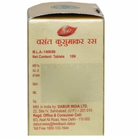 Dabur Vasant Kusumakar Ras with Gold & Pearl tablet contains Hataka, Chandra, Vanga Bhasma, Ahi, Loha Bhasma, Abhraka Bhasma, Pravala Bhasma, Mukta Bhasma, Godugdha, Ikshu, Vasa, Laksha, and Udeechya as its active ingredients.