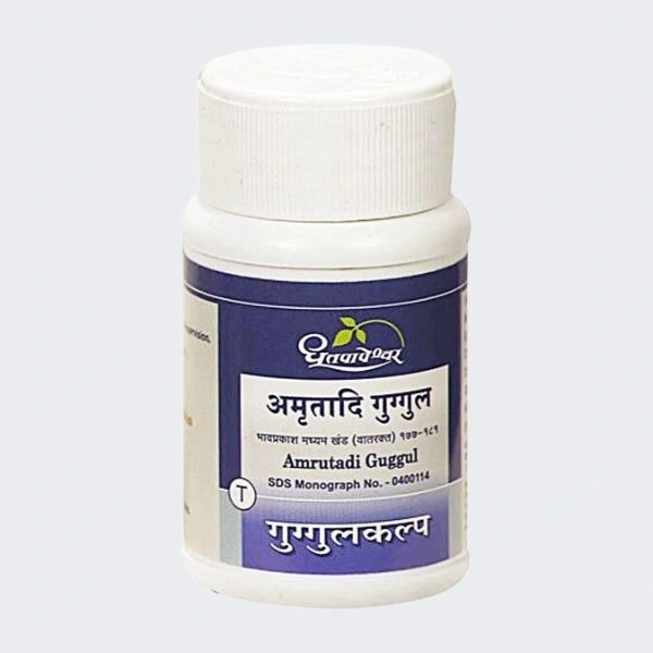 Dhootapapeshwar Amrutadi Guggulu (sometimes spelled Amritadi Guggulu) is a classical Ayurvedic Guggulu formulation prepared with Shuddha Guggulu, Guduchi, Amalaki, Haritaki, Bibhitaki, Pippali, Vidanga, Dalchini, Maricha, Shunthi, and Nishottar.