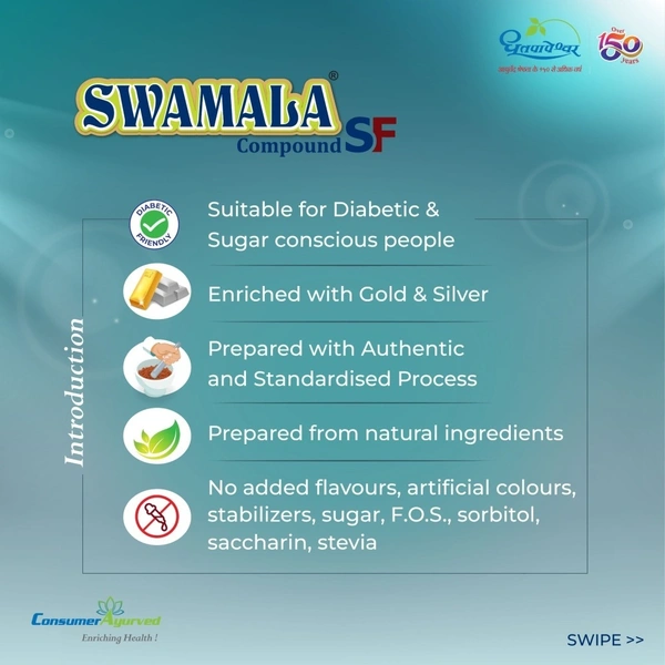 Dhootapapeshwar Swamala Classic SF is a sugar-free Ayurvedic Rasayan, designed for individuals seeking a Chyavanprash without added sugar. Made with high-quality Amla pulp, fortified with a unique blend of herbs, honey, and pure cow’s ghee, it is enriched with gold, silver, and potent Ayurvedic enhancers. This formula is especially suitable for those with dietary restrictions like high blood sugar level or obesity, promoting total health and immunity in all seasons.