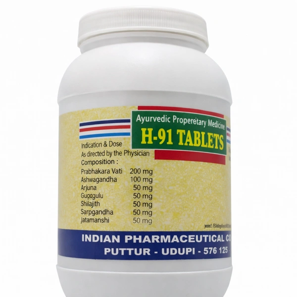 H-91 Tablet is an Ayurvedic herbomineral formulation developed by Indian Pharmacy. It is designed to support cardiovascular health and is particularly beneficial for conditions such as hypertension, hyperlipidemia, and other cardiac disorders.
