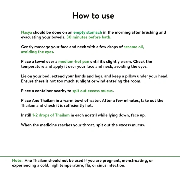 Nostrils are known as Shirodhara or the gateway to the head in Ayurveda. The nose is also the entry point of the vital breath or Prana vayu, which is crucial in maintaining vitality and mental clarity. According to Ayurveda, instilling herbal oils or Nasya is one of the essential holistic self-care practices that encourages healthy Prana flow and internal detoxification. Nasya helps to lubricate the nasal passages and clean out excess mucus from the sinuses. This helps reduce the frequency of sinusitis, allergies, and nasal congestion. Kerala Ayurveda Anu Thailam is made with Kapha balancing ingredients such as Leptadenia or Jivanti, Liquorice or Yashtimadhu, Fragrant Swamp Mallow or Hrivera & Indian bael or Bilva, and other herbs processed in goat’s milk and sesame oil. It helps clear the accumulated doshas from the nasal passage and enables you to breathe better!