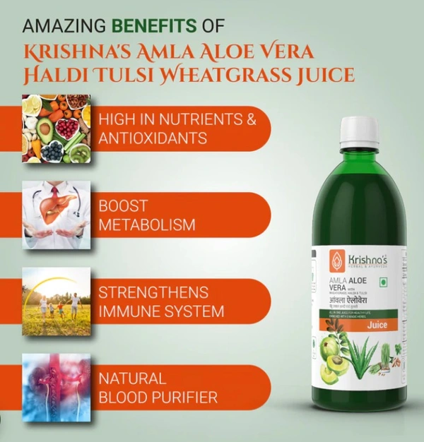 Krishna’s Amla Aloe Vera Wheat Grass Haldi Tulsi Juice is a super-healthy drink containing antioxidants that can help reduce inflammation throughout your body. It is rich in vitamin C, which is a powerful antioxidant that can help to detoxify your body and promote healing.
