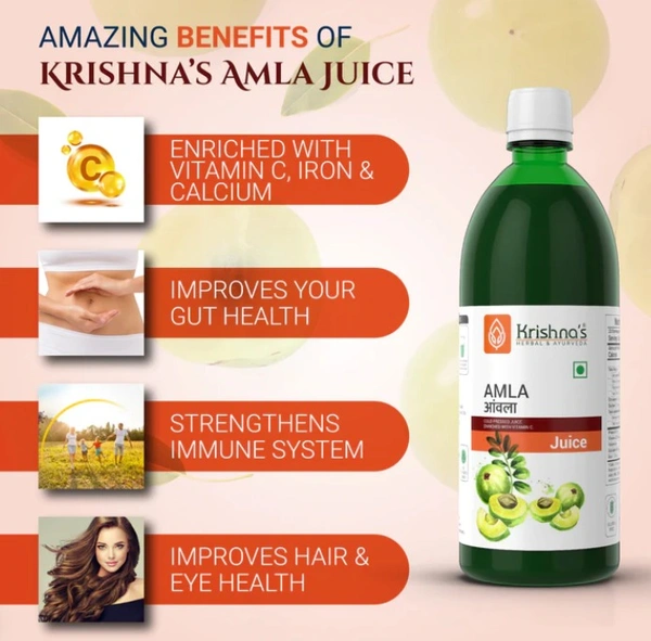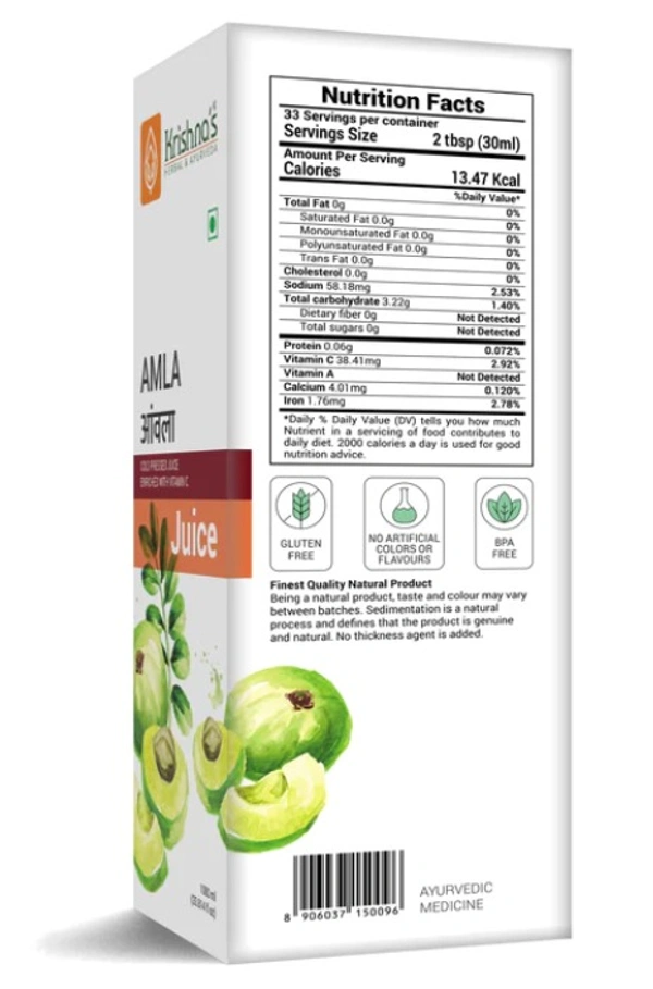 Krishna's Amla juice has been extracted from Indian Gooseberry or Amla to provide multiple health benefits for an active body and mind. It is a potent natural extract packed to solve most of our everyday health problems. Improves the appearance of your skin, supports healthy body functioning, boosts immunity, and strengthens bones. It effectively controls blood pressure and aids in treating the common cold and cough.