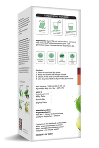 QUALITY & TRUST: Krishna’s Amla Ras is a trusted product. It is an Ayurvedic & herbal juice made in GMP, FSSAI-approved facility, and is made from organically sourced, natural ingredients. It is natural with no added chemicals, heat, sugar, flavors, or colors. Add 30 ml juice using the measuring cap to 30ml water. Consume twice a day before a meal. For best results, complete at least 1 bottle. After opening the bottle, consume it within 1 month.
