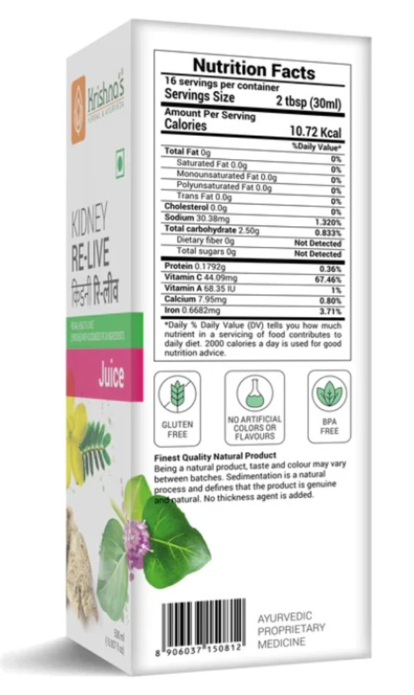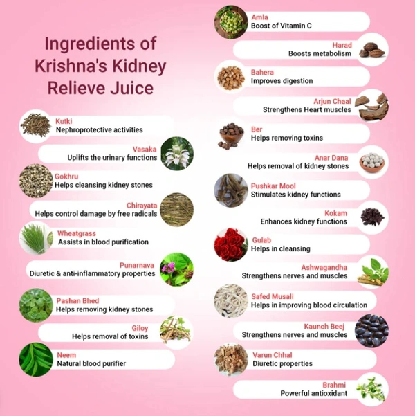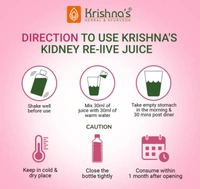 Krishna's Kidney Relive Juice is made up of all natural ingredients that have no side effects on your body. It helps to enhance kidney function by reducing urea and creatinine. A perfect combination of Ayurvedic herbs, including amla Harad, Baheda, Arjun Chal, Ber, Anar Dana, Pushkar Mool, Gulab, Ashwagandha, Safed Musli, Konch Beej, Varun Chal, Brahmi, Vasaka, Kutki, and numerous more ingredients.