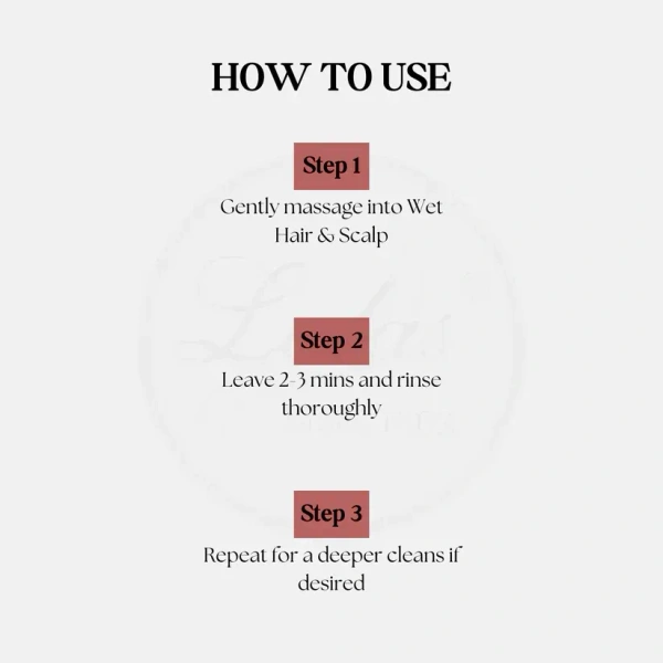 How to use: Gently massage into wet hair and scalp. Leave 2-3 minutes and rinse thoroughly. Repeat for a deeper cleanse if desired. Mild Shampoo for frequent use. Regular use will give best results.