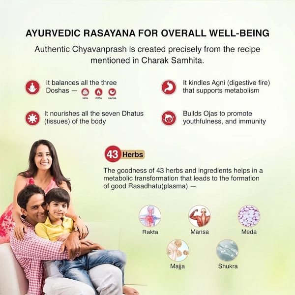 Chyavanprash is the best one among Rasayanas. It is a nutritious health revitalizer that boosts respiratory immunity and keeps common health problems caused by bacteria, viruses, and weather changes at bay. Authentic Chyavanprash is made from real and natural Vanshlochan. It is a powerful antioxidant that boosts the immune response of the body and has a restorative effect on lung tissues.