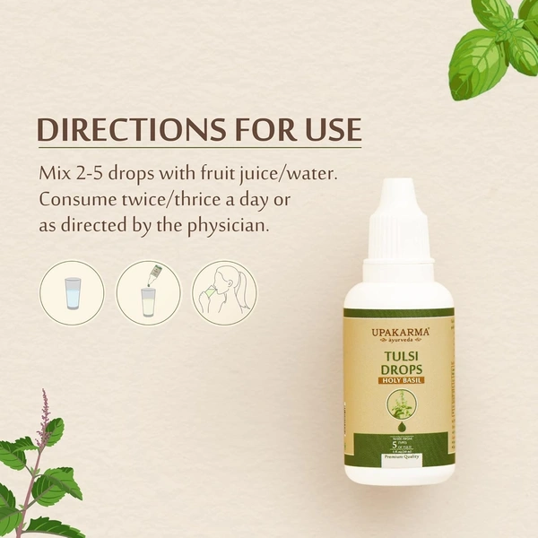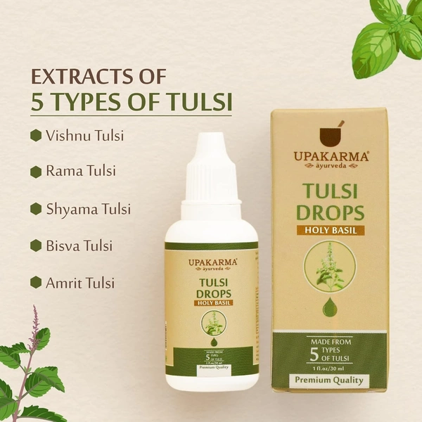 - Upakarma Ayurveda Tulsi drops are free from any preservatives and artificial colors. It is a pure and natural Ayurvedic product