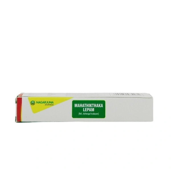 Nagarjuna Mahathikthaka Lepam is a herbal Ayurvedic formulation designed to aid in the healing of non-healing ulcers, chronic wounds, and skin conditions such as eczema. This medicated lepam (ointment) is infused with potent herbal oils and powders known for their antiseptic, anti-inflammatory, and wound-healing properties. When applied externally, it helps reduce itching, inflammation, and skin irritation, promoting faster recovery of damaged skin. Its cooling and soothing properties make it effective in addressing various skin disorders and preventing infections.