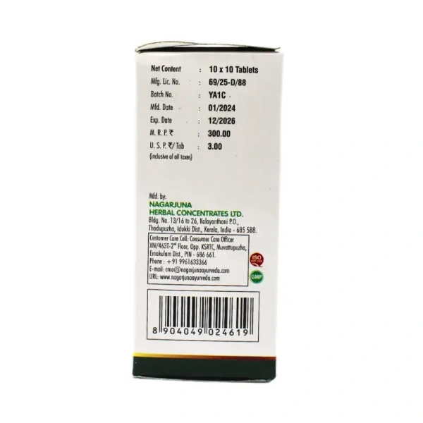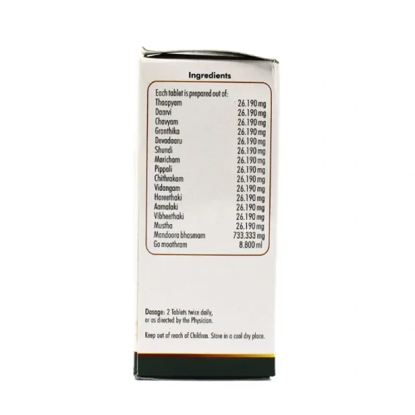 Dosage: Typically, 1–2 tablets once or twice a day after meals, or as directed by an Ayurvedic practitioner.