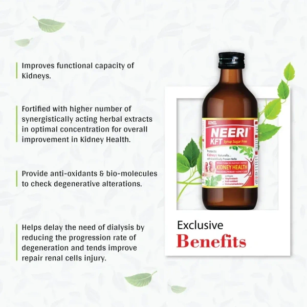 Neeri KFT is an ideal kidney functional toner that acts as a potent anti-oxidant, immune-modulator & nephron-protective, thus efficiently normalizing the deviated functional parameters of the kidney such as serum creatinine, serum urea, serum protein, etc.