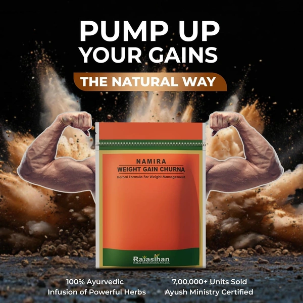 Namira Weight Gain Churna is an Ayurvedic supplement formulated by Rajasthan Aushdhalaya to support healthy weight gain, appetite enhancement, and muscle development using a blend of traditional herbs and nutritional boosters.