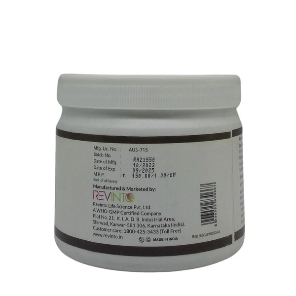 A traditional Ayurvedic skinācare bathing powder from Revinto, formulated to manage various chronic skin conditions such as eczema, dermatitis, psoriasis, urticaria, itching, and even pigmentation issues like postālesion discoloration.