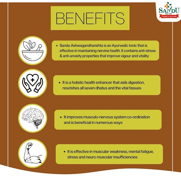 Sandu Ashwagandharishta is a classical Ayurvedic liquid tonic crafted using fermented herbal extracts, primarily featuring Ashwagandha (Withania somnifera). Manufactured by Sandu Brothers Pvt Ltd, it's presented in a 450 ml glass bottle to preserve its potency and shelf life.