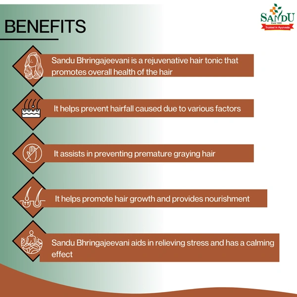 Sandu Bringajeevani is a 450 ml fermented herbal preparation by Sandu Brothers formulated primarily for hair growth, prevention of premature greying, and nourishment of scalp and body tissues through bioavailable herbal infusion.