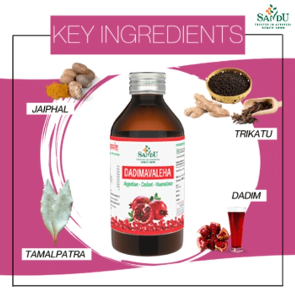 Sandu Dadimavaleha is a taste-friendly Ayurvedic tonic based on Punica granatum (pomegranate). It serves as an emetic control agent, appetizer, digestive balancer, and hepatininc—especially helpful in managing hyperacidity, nausea, and low hemoglobin levels among others.