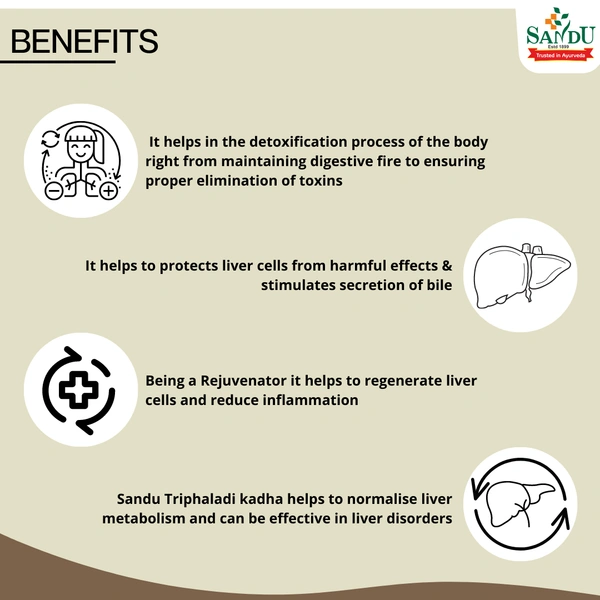 Sandu Triphala Kadha is a classical Ayurvedic decoction formulated by Sandu Pharmaceuticals, primarily used as a liver tonic and digestive support. It aids in improving hepatic function, enhancing appetite, and facilitating detox by stimulating bile flow.
