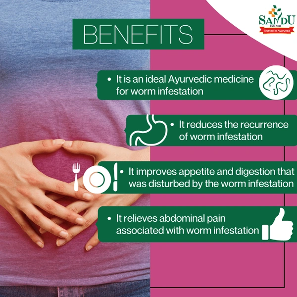 Helps alleviate abdominal pain, nausea, vomiting, and diarrhea due to worm infection