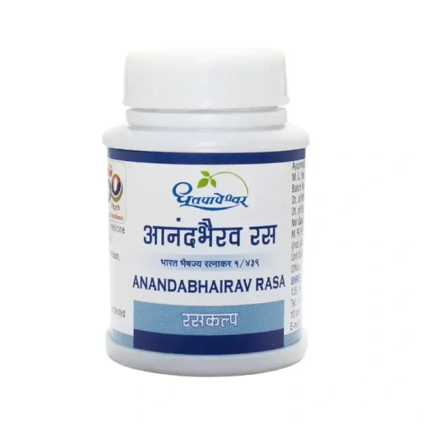 Anandabhairav Rasa (also spelled Anand Bhairav Ras) is a classical Rasakalpa formulation composed of purified minerals and herbs. According to Dhootapapeshwar, each tablet blends Shuddha Hingula (cinnabar), Shuddha Vatsanabha (aconite), Shuddha Tankana (borax), Maricha (black pepper), Pippali (long pepper), Sunthi (ginger), and Shuddha Gandhak (purified sulfur), processed with lemon (jambira) juice.