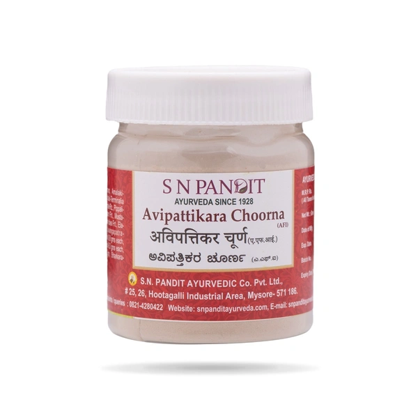 Avipattikara Choorna is a classical Ayurvedic herbal powder used primarily for digestive health. It is well known for balancing Pitta dosha and relieving acidity, gastritis, and indigestion.