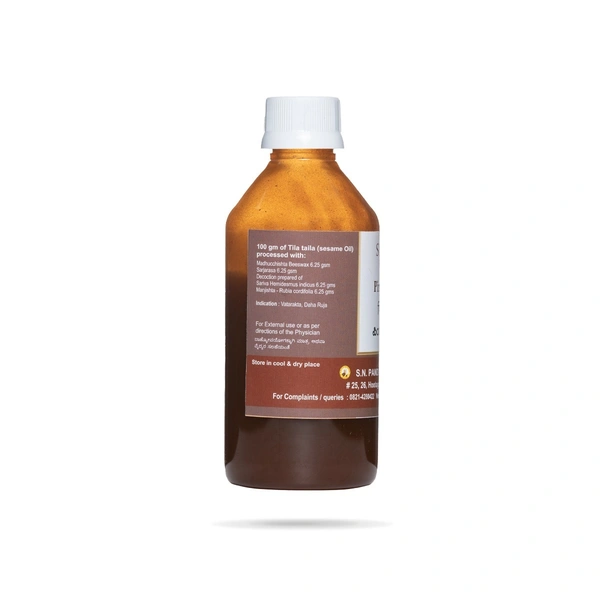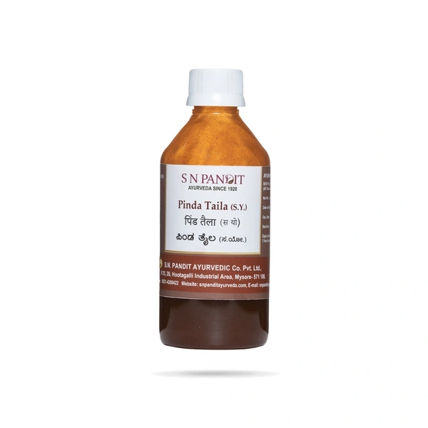 Pinda Taila is an Ayurvedic herbal oil typically used in massage therapy for relieving joint and muscle pain. It is known for its warming properties and is often used in treatments like "Pinda Sweda" in Panchakarma therapy, where the oil is applied to the body to improve circulation and reduce inflammation.