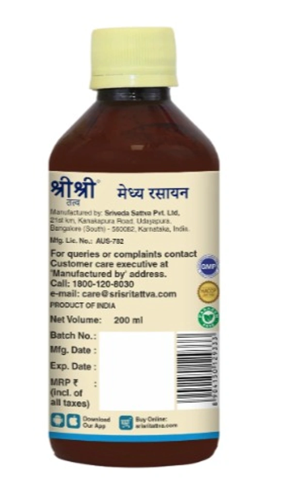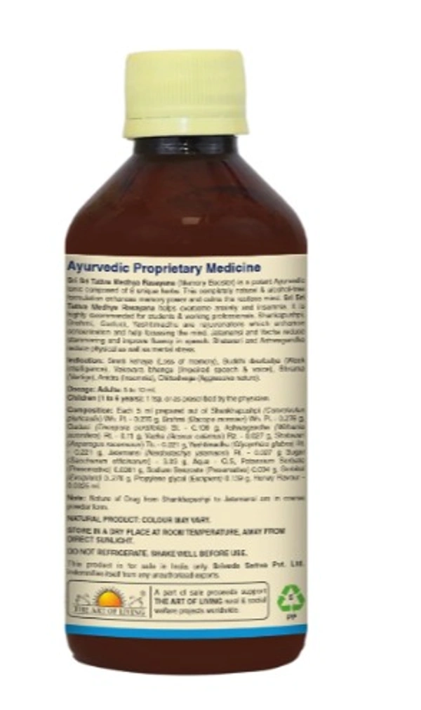 Sri Sri Tattva Medhya Rasayana Syrup is a potent Ayurvedic tonic composed of 8 unique herbs. This completely natural and alcohol-free formulation enhances memory power and calms the restless mind. It helps overcome anxiety and insomnia.