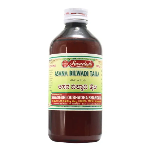 Asana Bilwadi Taila - Swadeshi by SWADESHI s1 is a premium Ayurvedic oil meticulously crafted to support your journey toward balanced health and overall well-being. Rooted in traditional Indian medicine, this therapeutic oil combines the power of nature's finest herbs to offer relief, rejuvenation, and a sense of harmony for your body and mind.