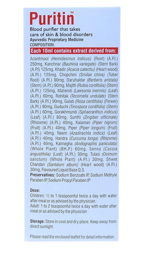 Puritin Liquid is an Ayurvedic herbal syrup from Unjha formulated to support respiratory health. It is traditionally used to relieve cough, cold, throat irritation, and congestion, promoting clear breathing and soothing the respiratory tract.