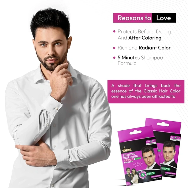 V Care Shampoo Hair Colour (Triple Plus) is an innovative hair colouring shampoo enriched with herbal ingredients for safe and effective grey coverage. Its advanced 3-in-1 formula not only colours but also cleanses and conditions hair in a single step, leaving it soft, shiny, and naturally beautiful.