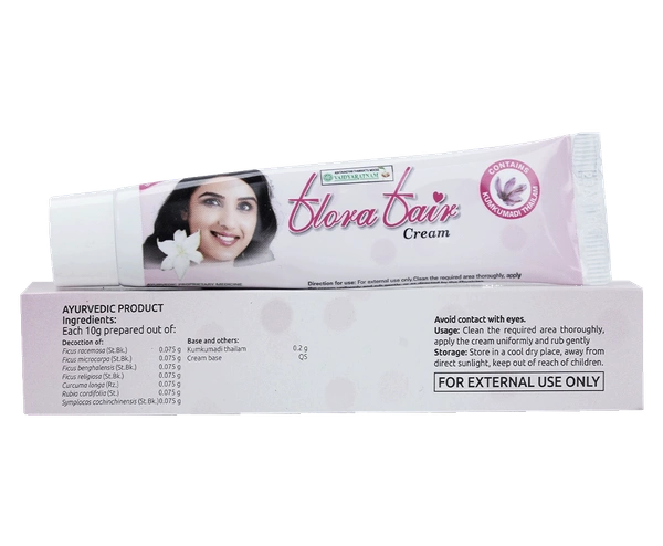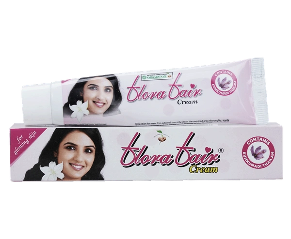 Vaidyaratnam Flora Fair is a traditional Ayurvedic herbal cream formulated to enhance skin complexion, nourish the skin, and reduce pigmentation. It is widely used for improving overall skin tone and health.