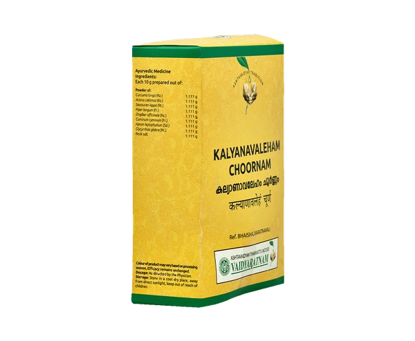Vaidyaratnam Kalyanavaleham Churnam is a traditional Ayurvedic preparation made with medicinal herbs known to support brain, nerves, and overall vitality. It is widely used to enhance memory, cognitive function, and general wellness.