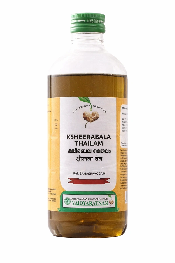 Vaidyaratnam Ksheerabala Tail is a traditional medicated oil prepared with Bala (Sida cordifolia), Ksheera (milk), and Tila Taila (sesame oil). It is highly valued in Ayurveda for its effectiveness in neurological disorders, Vata imbalance, and musculoskeletal conditions.